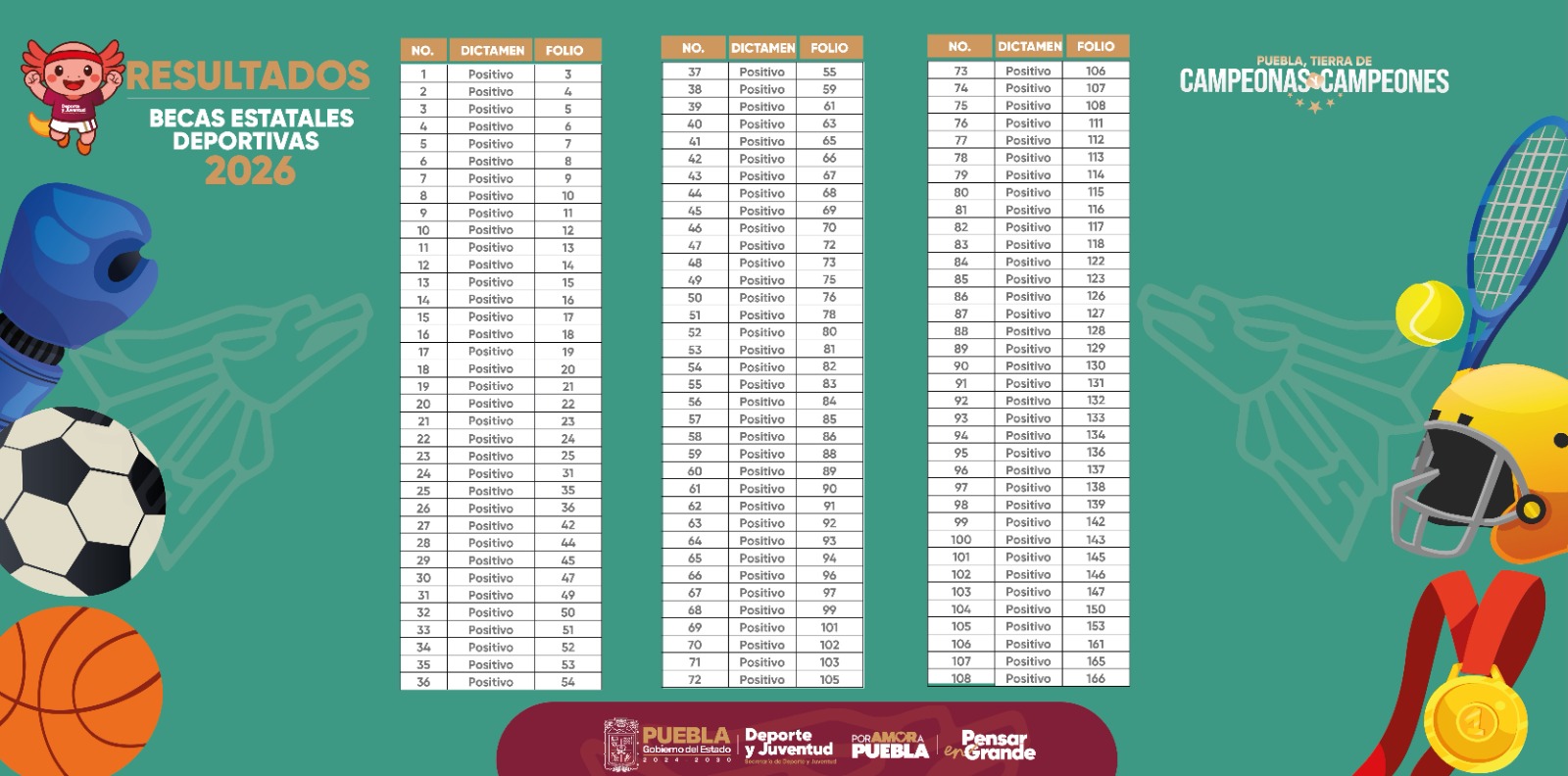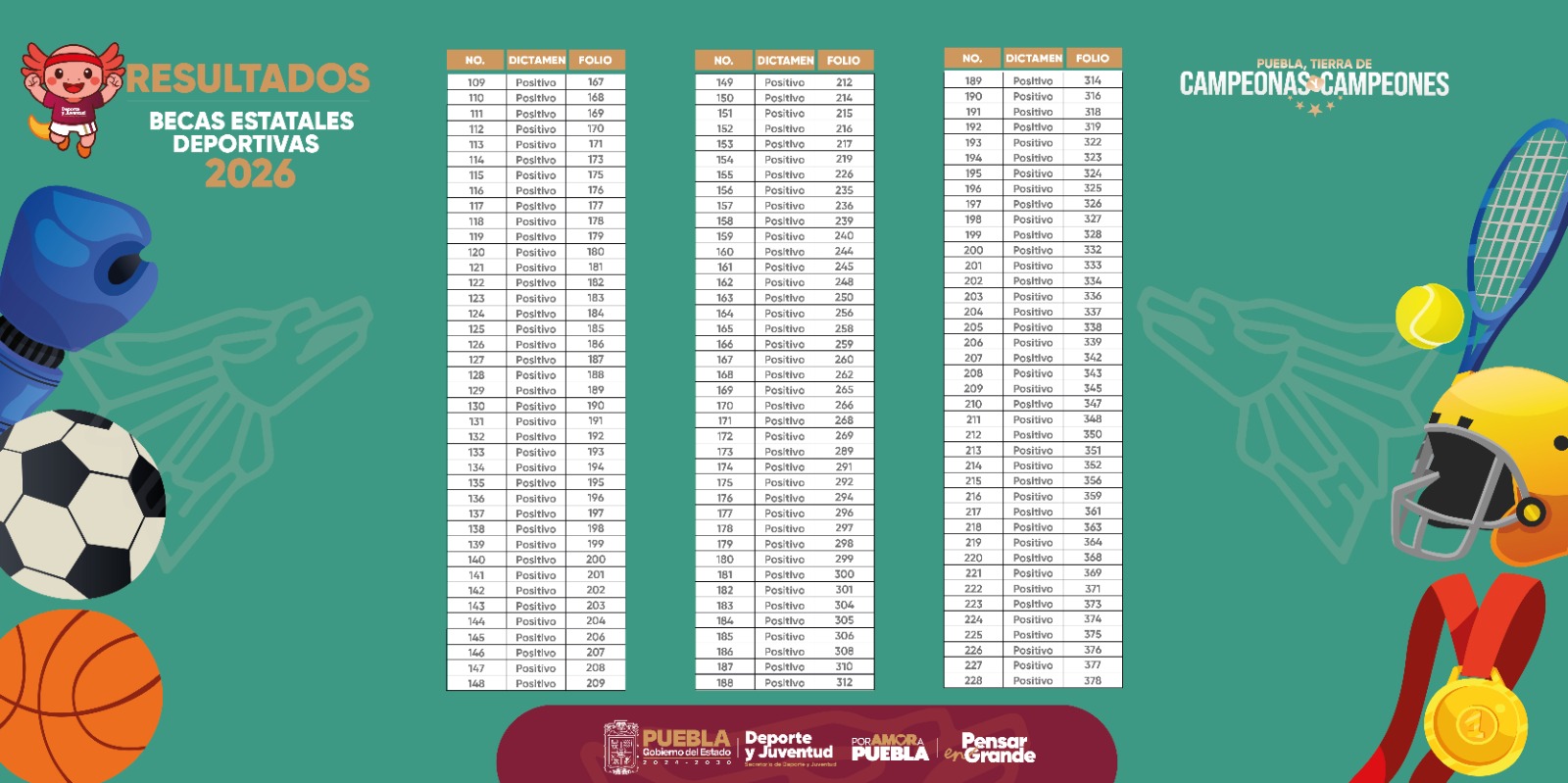 CIUDAD DE PUEBLA, Pue. - Como parte del apoyo que brinda el gobernador Alejandro Armenta Mier a las y los deportistas poblanos para su desarrollo integral, la Secretaría de Deporte y Juventud da a conocer los resultados de las y los aspirantes a becas deportivas 2026.