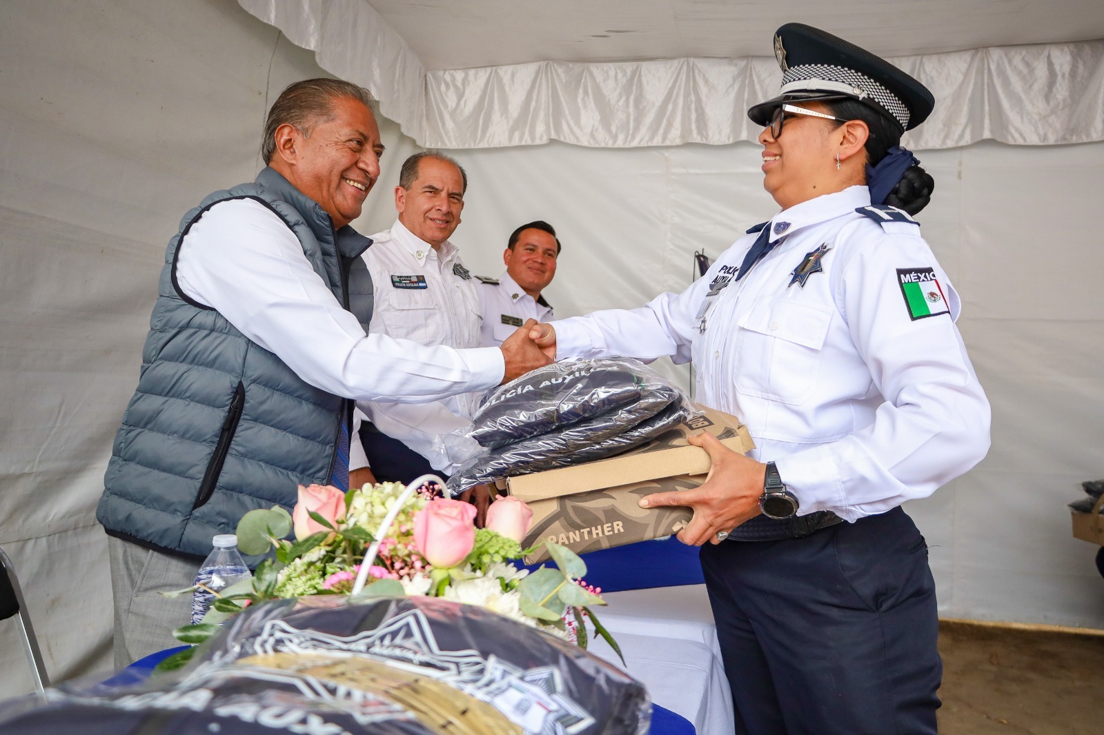 Con lo anterior, más de 3 mil 600 integrantes de la institución recibieron kits con camisola, chamarra, playera, pantalón, botas tácticas, cinturón, gorra, batas, chazarillas médicas y uniformes quirúrgicos.