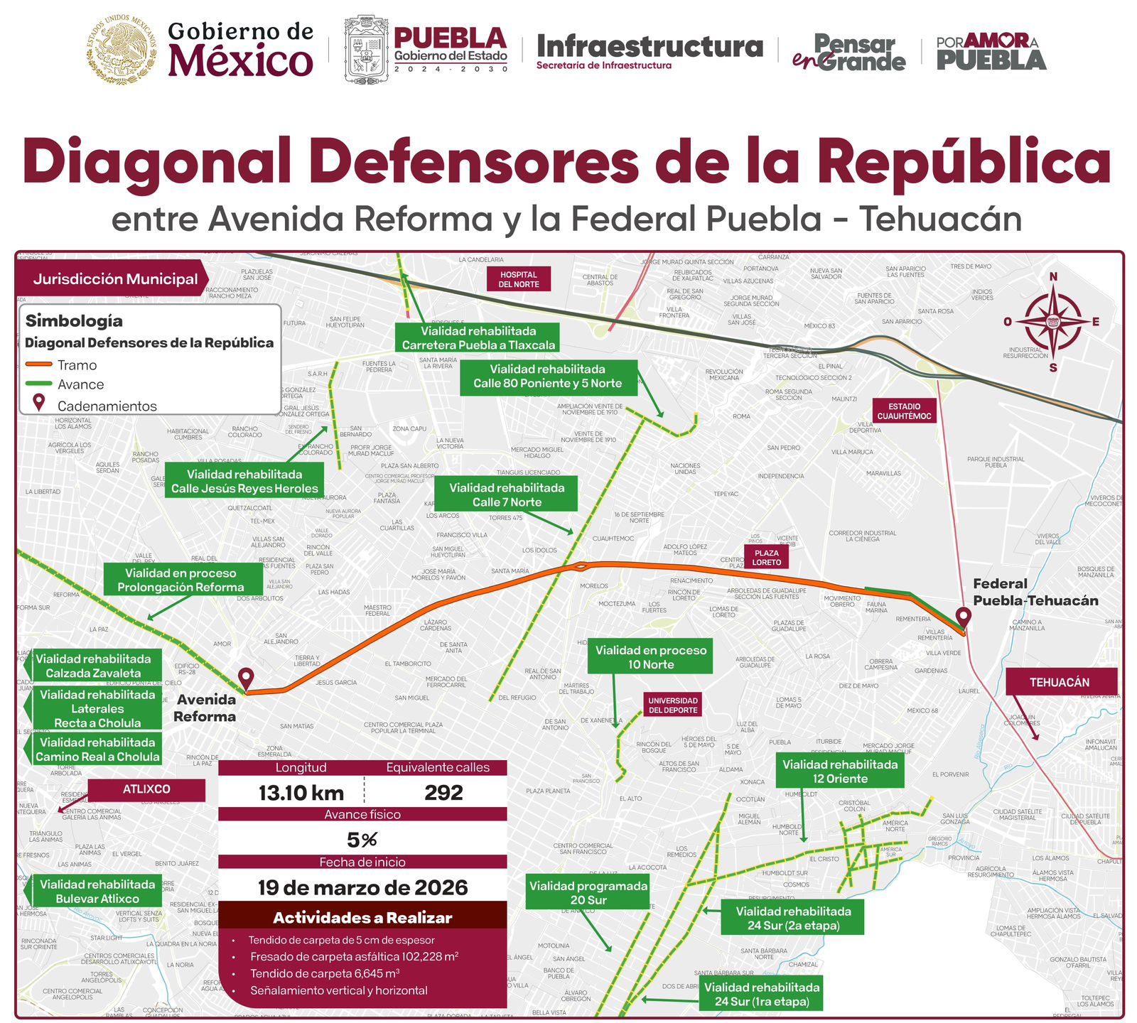 La intervención forma parte del programa integral de mejoramiento vial que contempla la rehabilitación de 5 mil calles en Puebla capital. Con una longitud equivalente a 292 calles y un avance del 5 por ciento, la obra inició el 19 de marzo de 2026 y atraviesa de sur a norte una de las vialidades más transitadas de la ciudad.