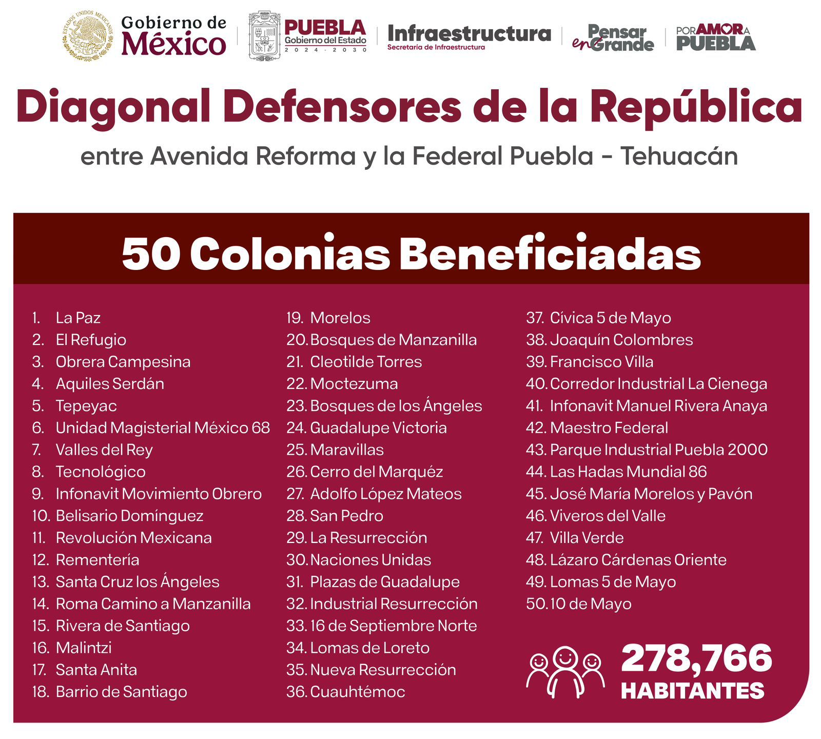 El secretario de Infraestructura, José Manuel Contreras, informó que esta rehabilitación beneficia directamente a 50 colonias, entre ellas La Paz, El Refugio, Aquiles Serdán, Bosques de Manzanilla, Lomas de Loreto y Parque Industrial Puebla 2000, lo que impacta positivamente a 278 mil 766 habitantes. Añadió que la obra se desarrolla en coordinación con el Gobierno de México, en línea con la visión de desarrollo urbano y movilidad eficiente impulsada por la presidenta Claudia Sheinbaum.