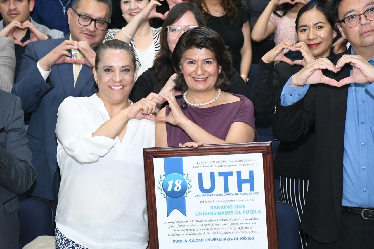 HUEJOTZINGO, Pue. — La Universidad Tecnológica de Huejotzingo (UTH) recibió el galardón que la ubica en el lugar número 18 de las mejores instituciones de educación superior del estado. Con esta distinción, otorgada por Universidades de Puebla, organismo dedicado a medir la calidad y evaluar programas educativos, la casa de estudios refrenda su compromiso con la formación de profesionistas de calidad.