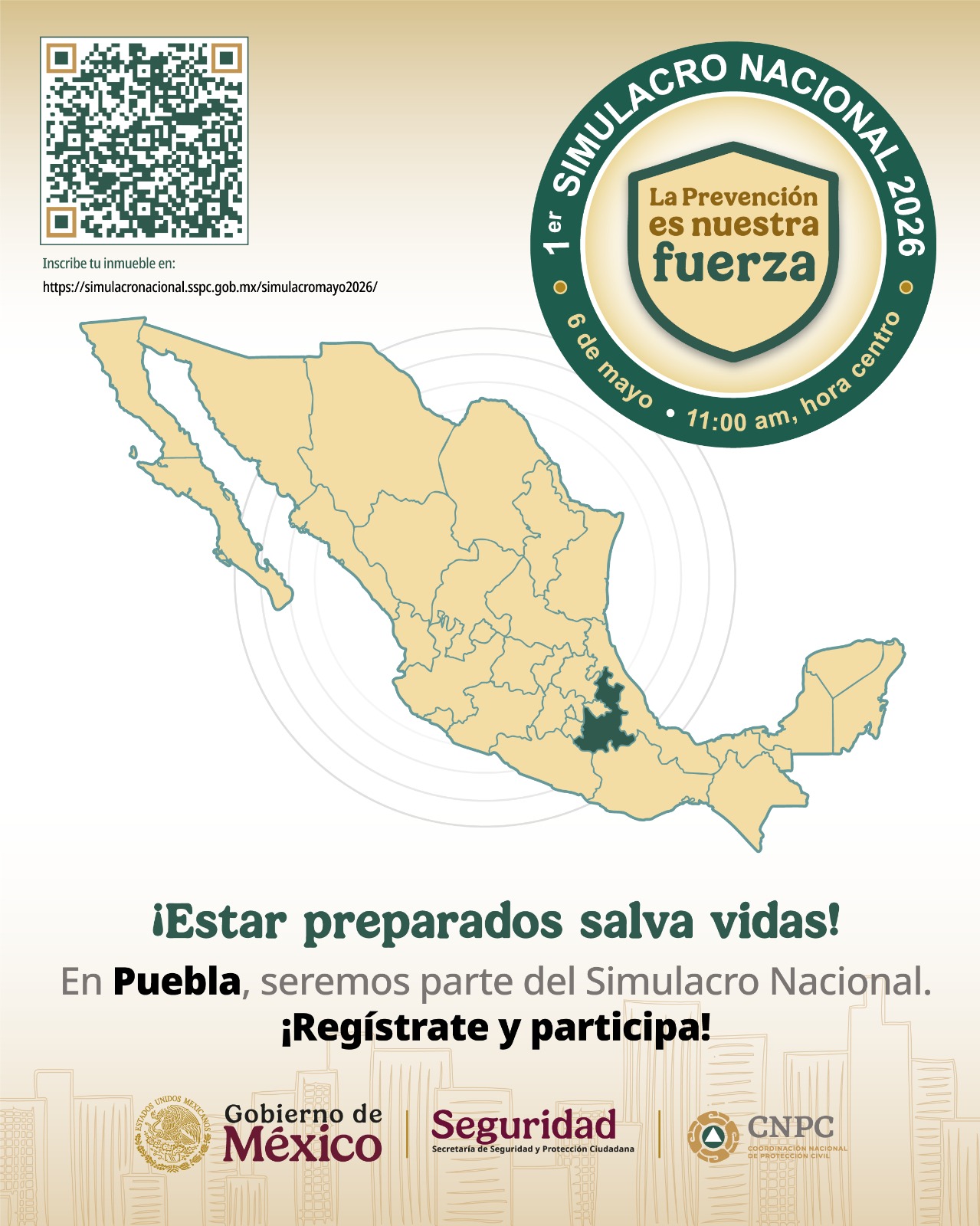 CIUDAD DE PUEBLA, Pue.- Para fortalecer la cultura de la prevención y la capacidad de reacción de la población ante una emergencia, el Gobierno de Puebla a través de la Coordinación General de Protección Civil, invita a la ciudadanía a sumarse al Primer Simulacro Nacional 2026, que se llevará a cabo el próximo 6 de mayo a las 11:00 horas.