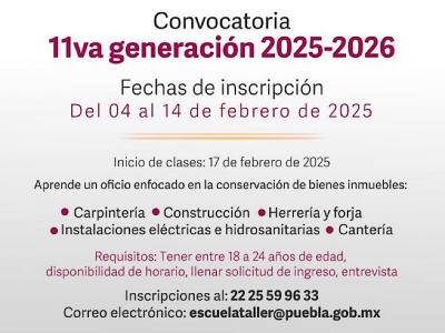 Gobierno de Puebla lanza convocatoria para nueva Generación de la Escuela Taller de Capacitación en Restauración